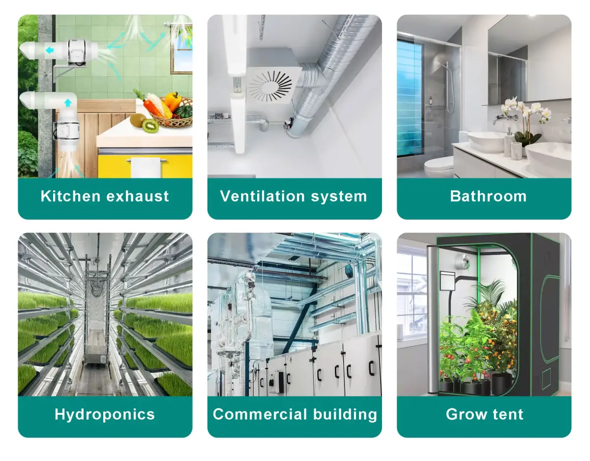 Heavy-duty metal duct fan is made of high-quality galvanized steel plates and is specially designed to withstand harsh environments such as high temperatures, high humidity, and corrosive gases. This heavy-duty inline duct fan features a large air volume and high air pressure. It can overcome certain resistance and enhance ventilation efficiency.it widely used in kitchen smoke exhaust, bathroom ventilation, commercial ventilation, pipeline dust removal, Engine Room Ventilation, marine ventilation, greenhouse planting workshop ventilation and so on.Whether it is for ventilation in commercial buildings or for the emission of high-temperature cooking fumes in commercial kitchens, it can operate stably and last for a long time.